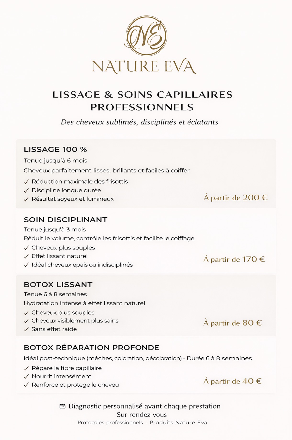 Fidèle à nos valeurs de toujours vouloir proposer aux professionnels de la coiffure des solutions révolutionnaires et innovantes, Lissage Nature Beauté, au travers de notre marque Nature Eva, vous propose toute une gamme de soin botox capillaire.